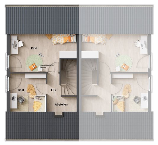 Über den offen gestalteten Treppenaufgang gelangen Sie ins Obergeschoss. Hier erwarten Sie ein Badezimmer und drei großzügige Zimmer. Die ideale Raumaufteilung lässt Ihnen viele Möglichkeiten Ihre Gestaltungswünsche umzusetzen. Unter dem Dach bietet Ihnen das Studio den perfekten Platz für Hobby, Arbeit oder Gäste. Besonders praktisch ist auch der Abstellraum.