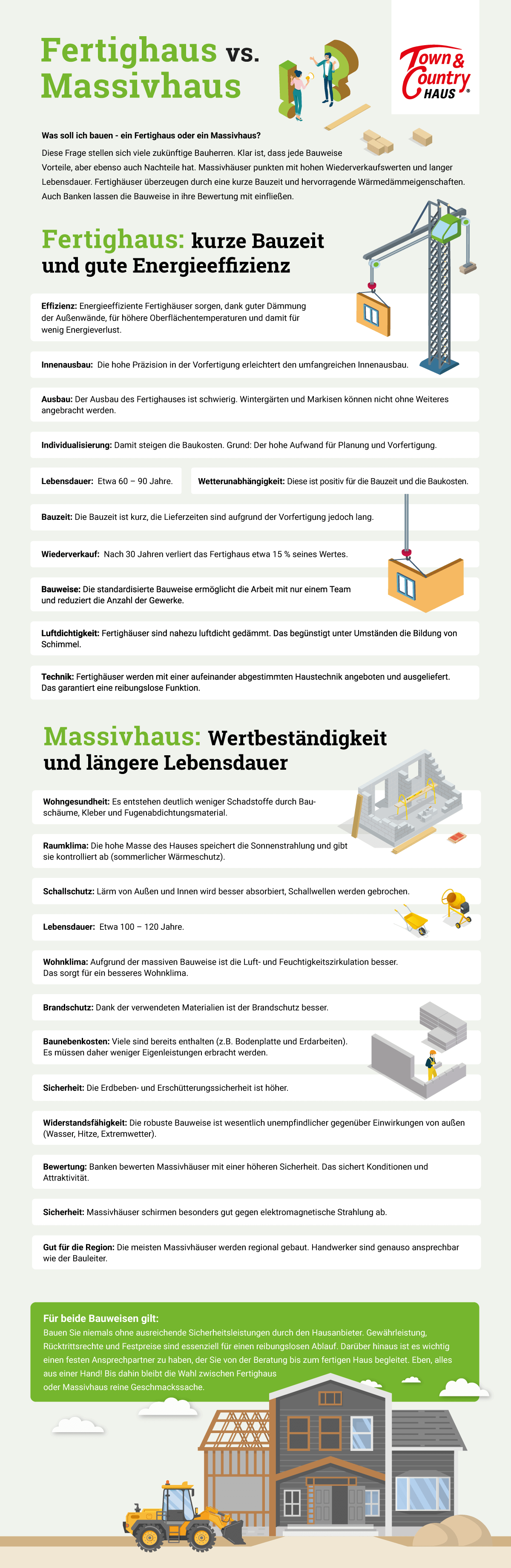 Beide Bauweisen sind in Deutschland weit verbreitet und haben aufgrund ihrer jeweiligen Vorteile auch ihre Daseinsberechtigung. Dabei spielt nicht nur der Aspekt der Gesamtbaukosten eine wichtige Rolle, sondern ebenso die Bauzeit. In den nachfolgenden Übersichten sind sämtliche Vor- und Nachteile beider Bauweisen zusammengefasst.